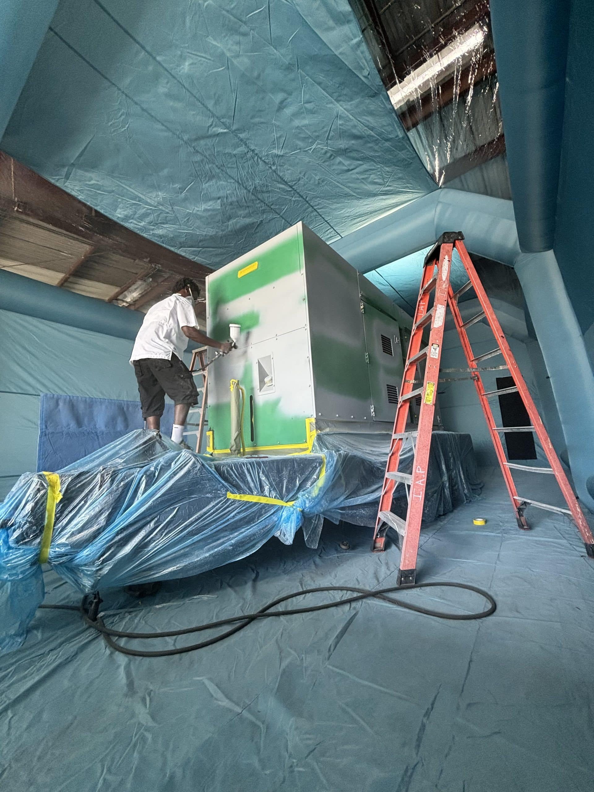 Our skilled team utilizes specialized equipment and premium additives to safeguard the paint and gloss, ensuring long-lasting durability even amongst changes in precipitation and temperature. Thanks to an enclosed tent, we are able to shield your generators from any environmental factors, guaranteeing a superior restoration that will keep your backup power looking brand-new for years to come. This also allows us to prioritize environmental safety as we can control the effects any used materials could have on it.